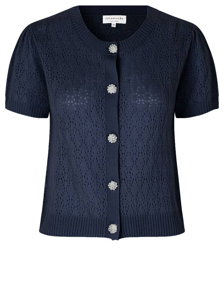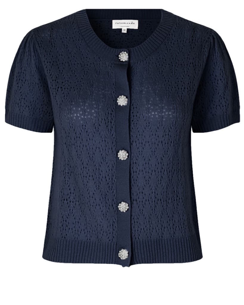 Cardigan Mørk blå – Rosemunde. Nydelig cardigan med kort arm, rund utringning, og dekorative knapper foran.