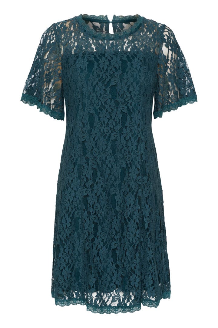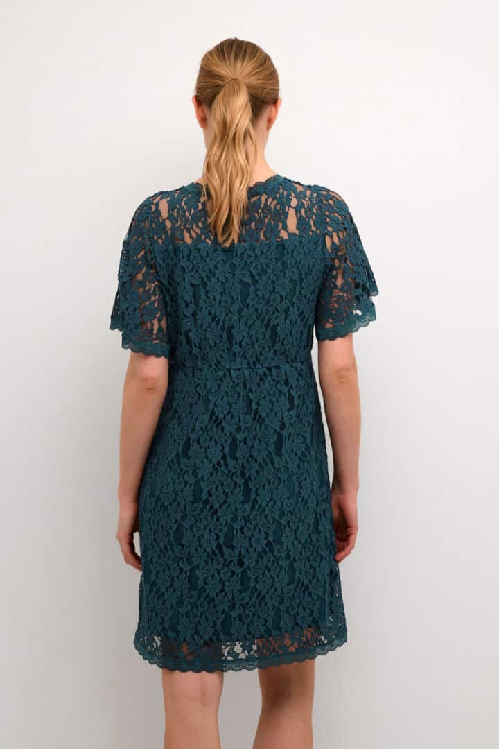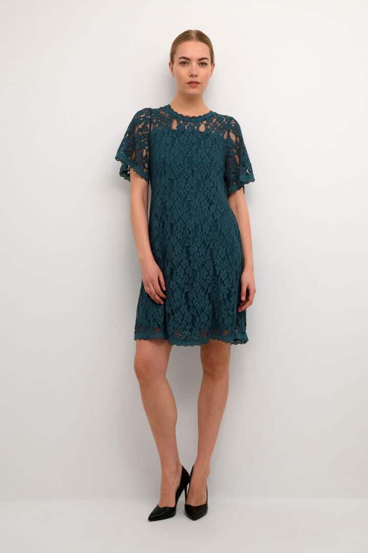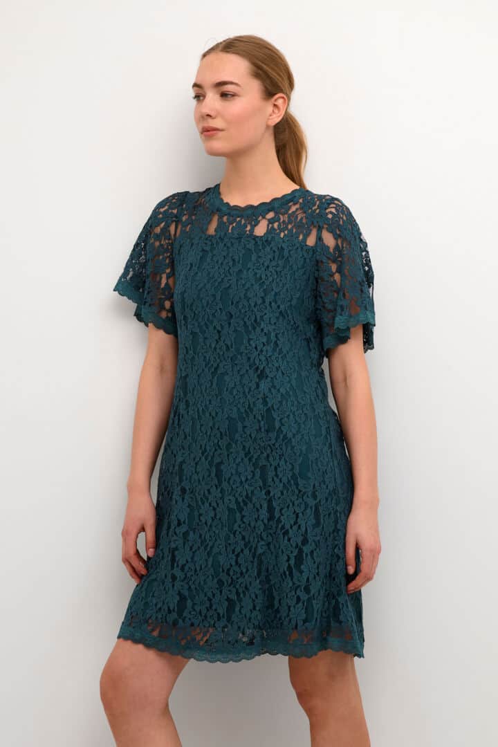 Lekker blondekjole med for foran og bak. Bli med på festen i denne flotte kjolen fra CREAM. Kjolen rekker til over kneet, har korte vide armer og lukkes bak i nakken med knapp.