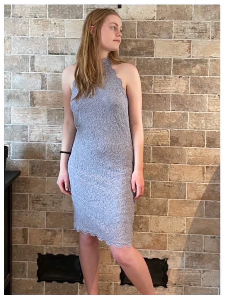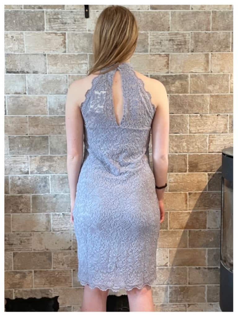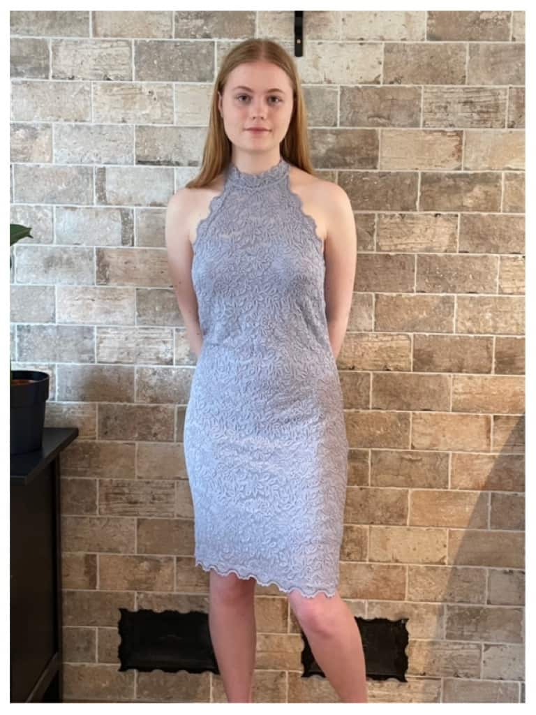 Kjole Lavendelblå – Rosemunde. Elegant og feminin kjole i delikat blondemateriale.