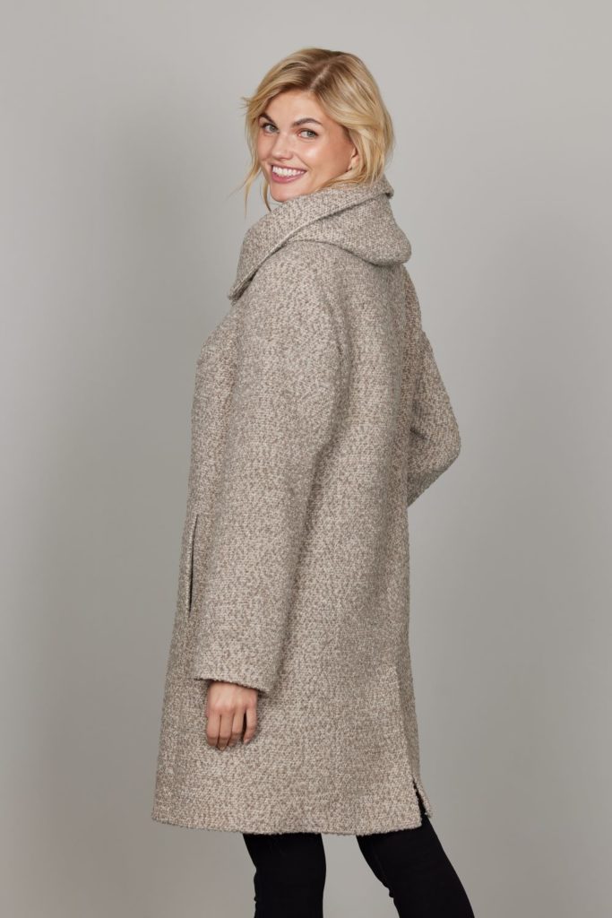 Kåpen er designet med en stor hette som også fungerer som en elegant krave.