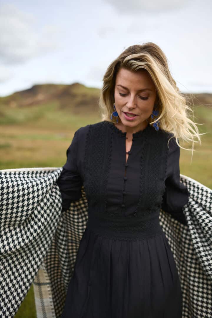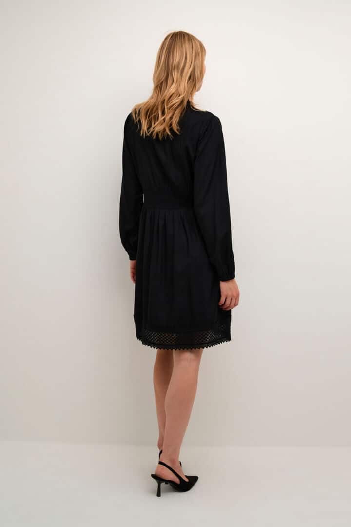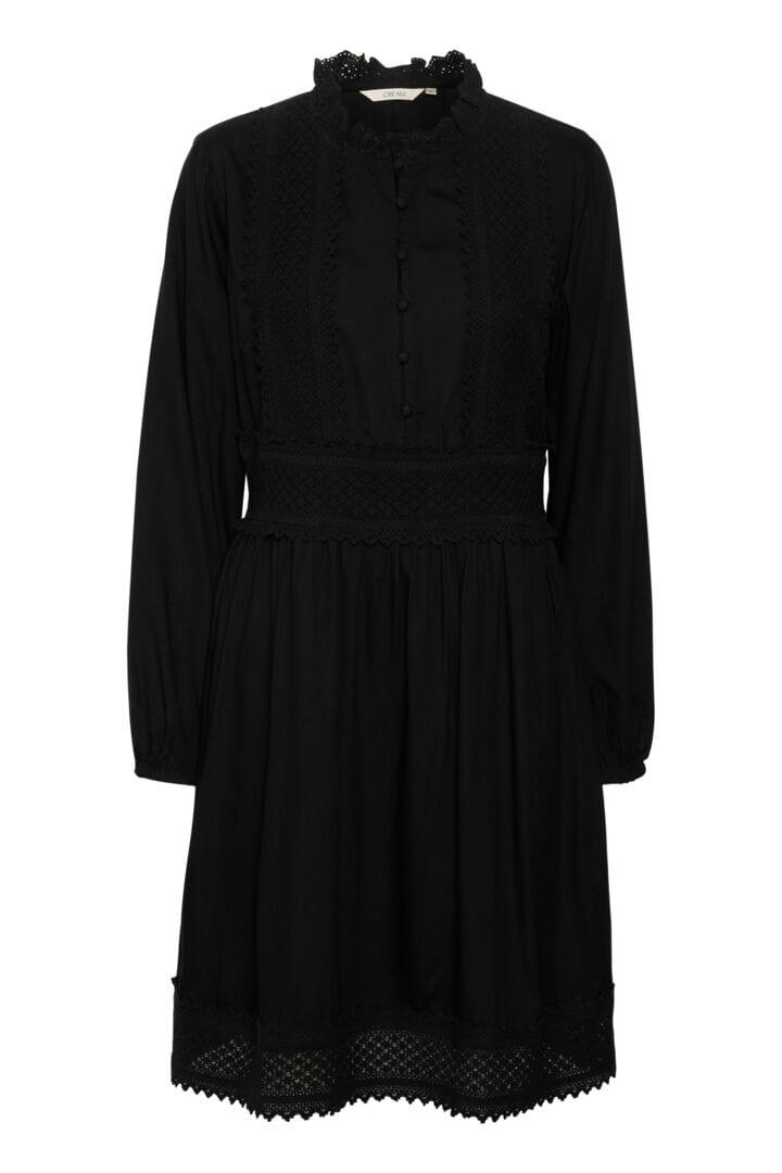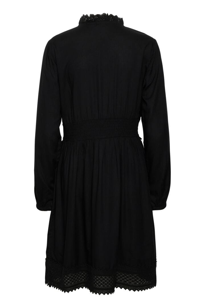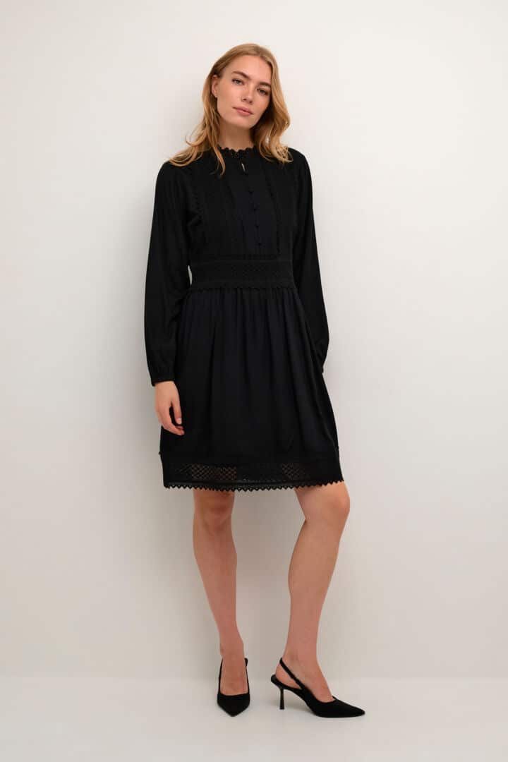 Nydelig feminin kjole i 100% viskose. Kjolen har et bredt markert liv. Dekorative påsydde blonder på ermene og nederst på kjolen.