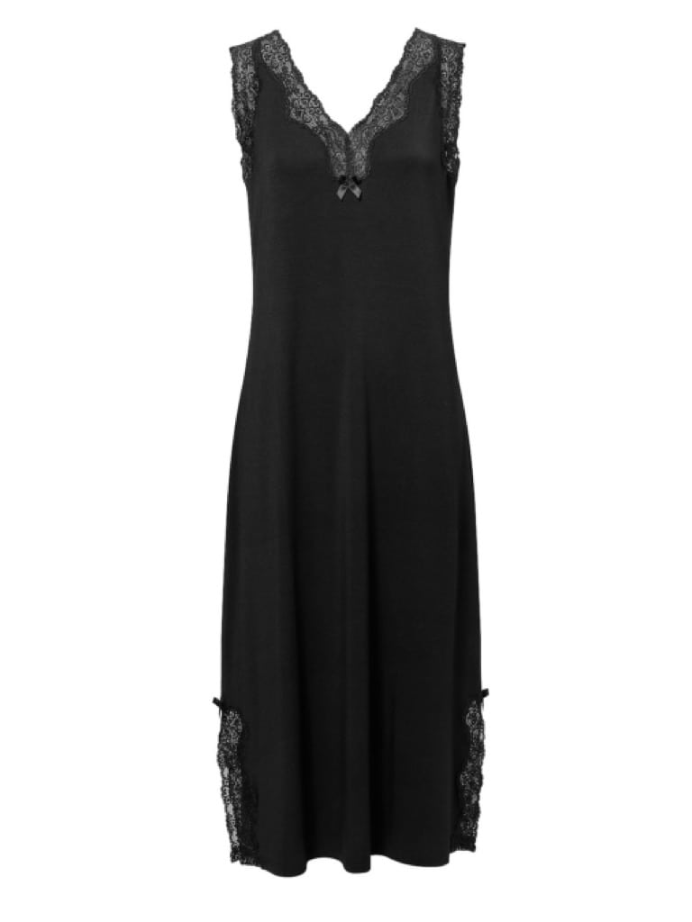 Modellen er lang, og er uten ermer. Splitt i sidene med blonde.
