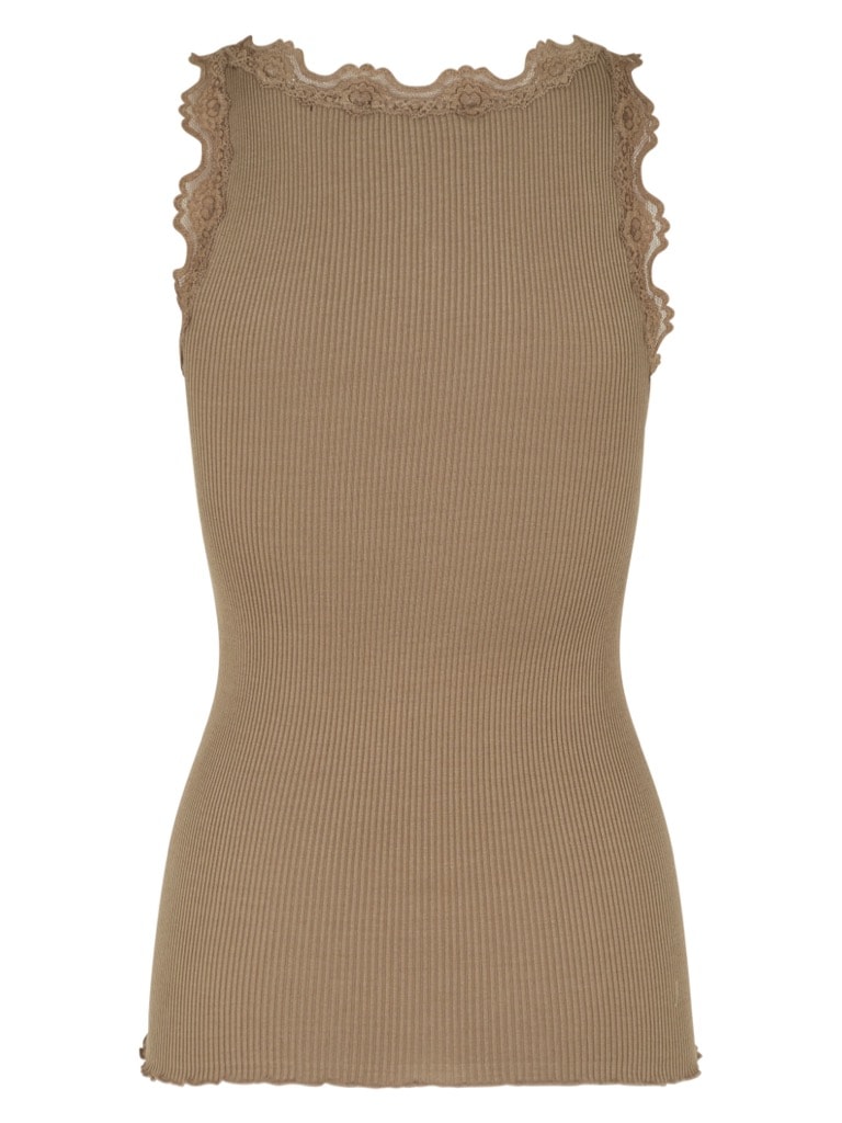 Toppen er en ribbestrikket klassiker med fine blondedetaljer.