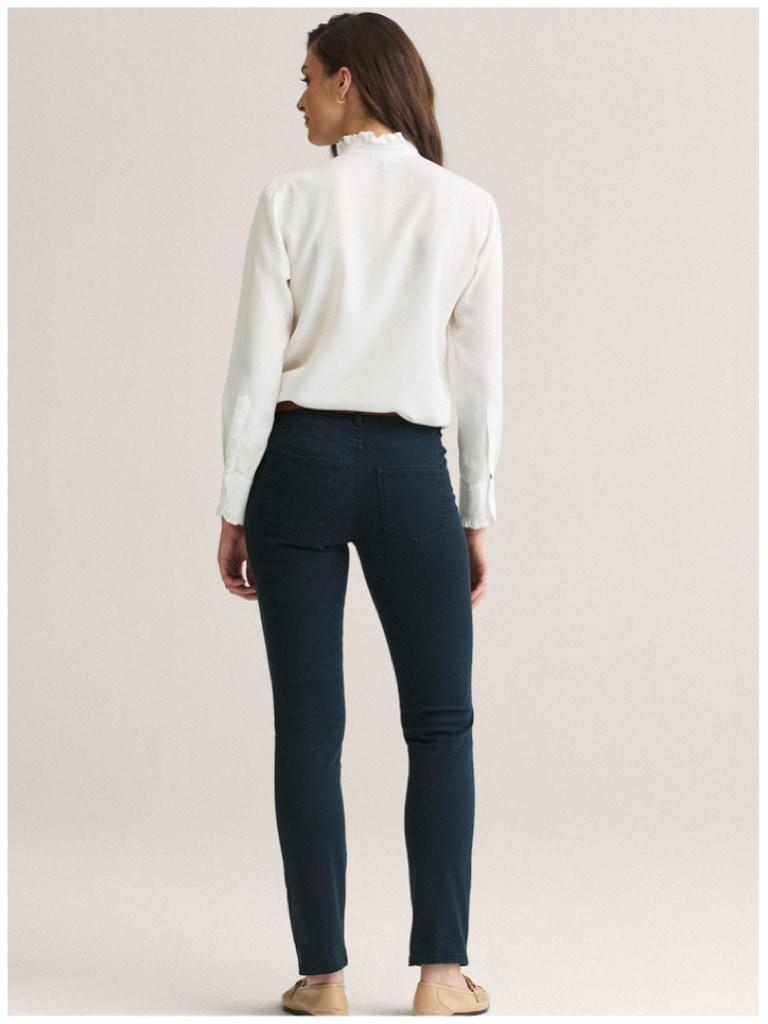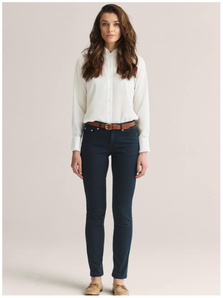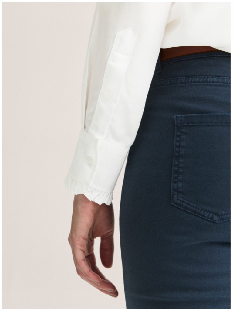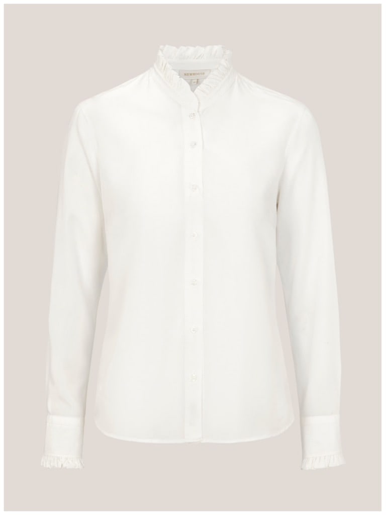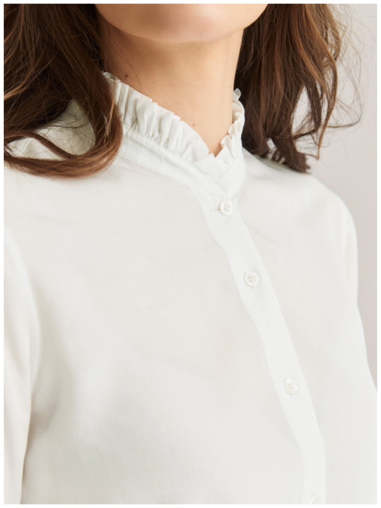 Feminin skjortebluse med søt rynket krave og en nett rynket kant på mansjetten. Skjorten knappes med små hvite logoknapper. Bruk skjorten alene eller under en kardigan eller blazer.